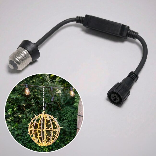 Attention : ce produit a été spécialement conçu pour connecter une guirlande lumineuse à un câble guinguette. Au lieu d’une ampoule, vissez cet adaptateur dans une douille E27, puis raccordez facilement une guirlande lumineuse.