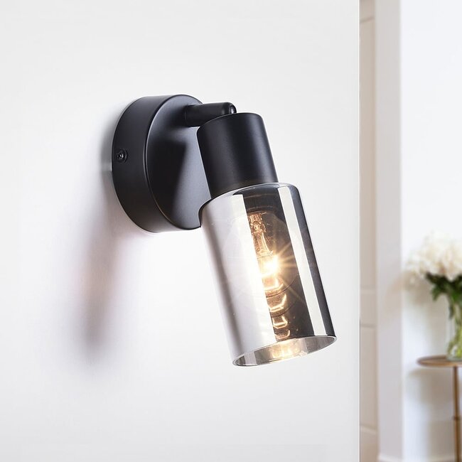 Mesurant 9 x Ø6 x 14,3 cm, ce luminaire mural est adapté à presque toutes les surfaces. Il est disponible en noir avec une base en métal et un abat-jour en verre fumé ou ambré. Son orientation réglable permet de diriger facilement la lumière. Conçu exclusivement pour un usage intérieur avec son indice de protection IP20.