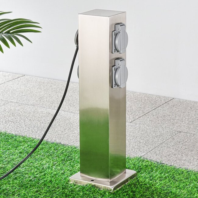 Sur les deux côtés de la borne en acier inoxydable se trouvent deux prises de courant extérieures. Cela vous permet de connecter facilement plusieurs appareils à la fois. La borne Fabrizio est donc très facile à utiliser. Surtout si vous avez un grand jardin et que vous voulez utiliser vos outils de jardinage électriques à plusieurs endroits, le Fabrizio est une solution idéale. Vous pouvez désormais éviter les mètres de rallonges.