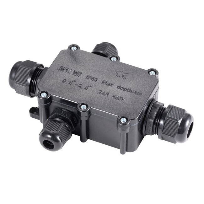 Ce connecteur étanche est idéal pour connecter simultanément plusieurs câbles de votre éclairage de jardin. Ce connecteur permet de relier quatre câbles entre eux. Le connecteur est fabriqué en plastique. La tension de connexion maximale de ce connecteur est de 450V(AC)24A. Le connecteur a une longueur de 9,6 centimètres, une largeur de 6,5 centimètres et une hauteur de 3,5 centimètres. Le connecteur peut accueillir deux câbles PG11 et deux câbles PG13.5.