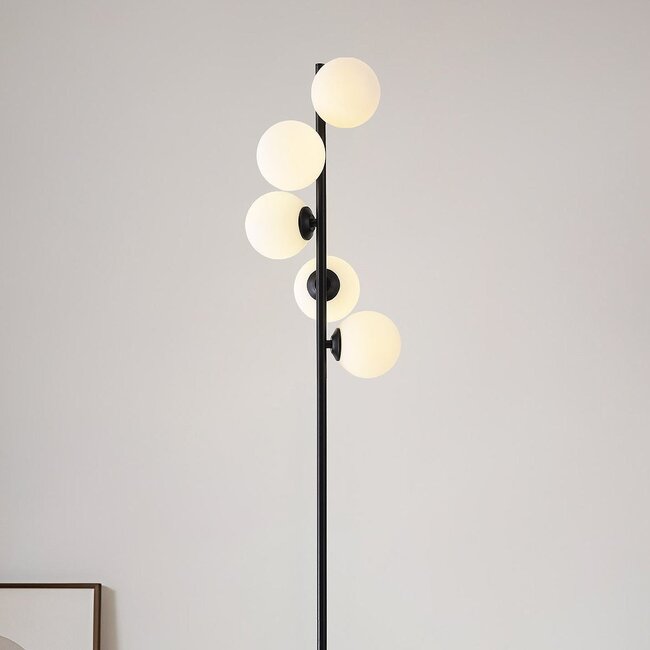 Apportez une touche d'élégance à votre intérieur avec ce lampadaire design Tyson. Cinq globes en verre opale sont élégamment montés sur une structure en métal noir. L'association de deux couleurs et de deux matériaux crée un style luxueux qui s'intègre parfaitement à tous les intérieurs.
