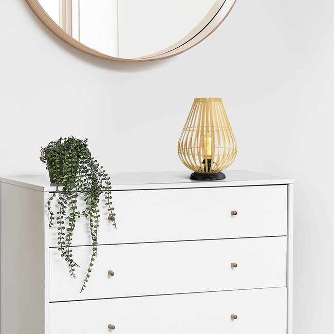 Combiner des matériaux industriels avec un look bohème ? C'est ce que représente Mae. Placez cette lampe de table confortable dans un salon moderne ou mettez de l'ambiance dans votre chambre à coucher. Les bandes métalliques sur l'abat-jour contribuent à un effet d'ombre particulier et à une diffusion optimale de la lumière.