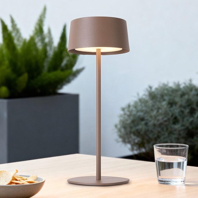 Profitez d'un éclairage d'ambiance dans votre jardin grâce à la lampe de table rechargeable Auris. Le design élégant de la lampe en fait un complément de choix pour votre terrasse, votre balcon ou votre jardin pendant les longues soirées d'été. Grâce à la batterie intégrée, vous pouvez utiliser la lampe sans fil et la placer exactement là où vous avez besoin de plus de lumière. Grâce à la fonction variateur, vous pouvez facilement régler l'intensité lumineuse souhaitée. La lumière blanc chaud (2700K) crée toujours l'atmosphère adéquate. Outre l'extérieur, Auris peut également servir à améliorer subtilement l'ambiance dans la maison. Grâce à sa conception résistante aux éclaboussures (IP44), cette lampe de table est spécialement conçue pour une utilisation extérieure sans souci.