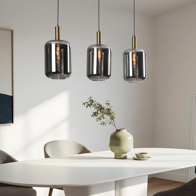 Créez une atmosphère accueillante dans votre salle à manger ou votre cuisine avec cette lampe suspendue au design unique. La suspension dorée sophistiquée combinée au cadre noir saisissant donne à la lampe un aspect chic et élégant, parfait pour votre intérieur moderne. Les trois ampoules en verre fumé sont suspendues côte à côte, créant un design uniforme. Cela crée une ambiance "hôtel chic" sereine et accueillante dans n'importe quelle pièce.