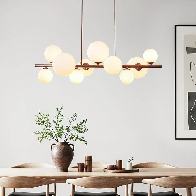 La suspension Deka allie élégance et caractère ludique. Son long cadre brun et ses dix boules en verre blanc laiteux diffusent une lumière chaude et homogène, idéale au-dessus d'une table à manger ou d'un îlot de cuisine. Les boules sont disposées de manière ludique sur le cadre épuré, conférant à Deka un aspect raffiné et aérien qui apporte une touche élégante à n'importe quelle pièce.