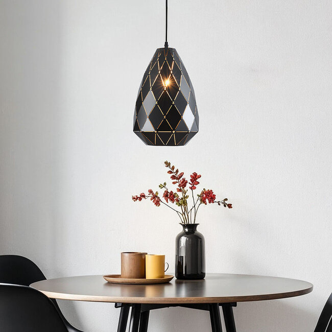 Découvrez comment la lumière et la géométrie peuvent se compléter grâce à la lampe suspendue Jupiter. Cet accroche-regard a une aura mystérieuse grâce au jeu de lumière et de brillance. Jupiter est un ajout chic à tout intérieur, bien qu'elle se sente plus à l'aise dans un espace de vie contemporain. L'abat-jour noir a une forme élégante qui rappelle une goutte de pluie tombant sur le sol. La lampe se compose d'un arrangement de plaques juxtaposées, dont chacune est finie en métal brillant. La lumière est diffusée par les subtiles ouvertures entre les plaques brillantes et par le dessous de la lampe. Cette distribution de lumière diffuse crée une belle lumière, idéale pour un éclairage d'ambiance dans le couloir ou dans le salon. Jupiter fait également bonne figure au-dessus de la table à manger. Pour renforcer encore l'effet lumineux, vous pouvez faire varier l'intensité de la lampe à l'aide d'un variateur externe. Complétez la lampe avec une source lumineuse blanc chaud avec un raccord E27 (variateur et source lumineuse non inclus). Conseil supplémentaire : combinez Jupiter avec une source de lumière LED avec du verre ambré pour un effet de lumière chaud supplémentaire. La lampe suspendue a une largeur de 24,5 cm et une hauteur de 35,5 cm. La lampe suspendue Jupiter allie classe et élégance comme nulle autre.