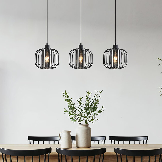Vous êtes à la recherche d'une lampe suspendue qui attire l'attention et fournit une lumière homogène ? Optez pour Dilan. Les trois suspensions sont montées de manière uniforme sur la plaque de plafond et créent un design homogène. Les abat-jours ouverts en verre fumé sont très chics. La source lumineuse se trouve à l'intérieur du boîtier en verre, ce qui produit une lumière douce, tandis que la lumière à travers les barres métalliques crée des ombres dansantes sur votre plafond ou votre mur. Suspendez Dilan, par exemple, au-dessus d'une longue table à manger ou d'un îlot de cuisine pour un look atmosphérique.