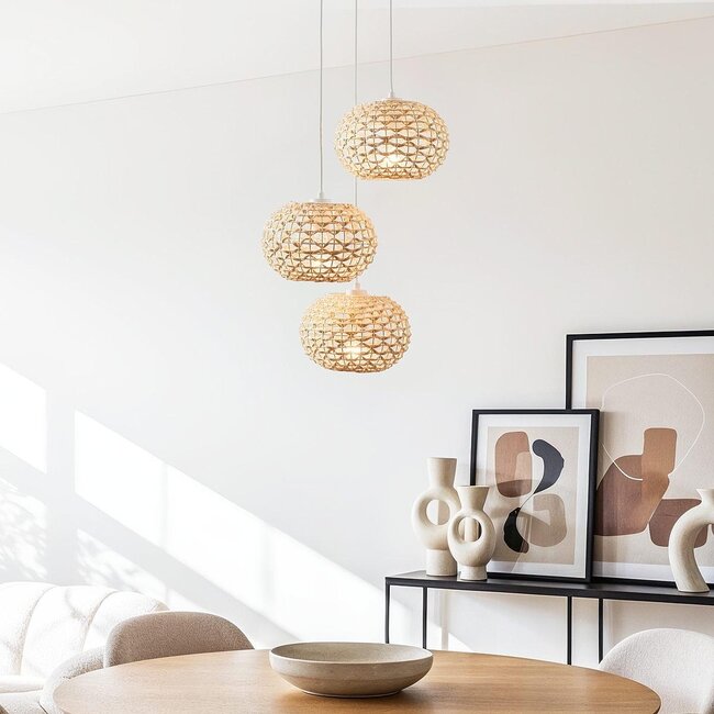 Ajoutez de la chaleur, de la texture et une touche ludique à votre intérieur avec la lampe suspendue Canaba. Cette lampe unique se compose de trois abat-jours en rotin tressés à la main (longueur de cordon max. 150 cm) qui sont suspendus à différentes hauteurs, créant ainsi un effet dynamique et atmosphérique. Chaque abat-jour mesure Ø24 x 16 cm et dispose d'une douille E27 (source lumineuse non incluse). La structure ouverte du rotin diffuse une lumière douce et décorative, idéale au-dessus d'une table à manger ronde, dans un hall d'entrée élevé ou pour attirer l'attention dans le salon. Grâce à son matériau naturel et à ses formes organiques, Canaba s'intègre sans effort dans les intérieurs boho, modernes-naturels ou scandinaves.