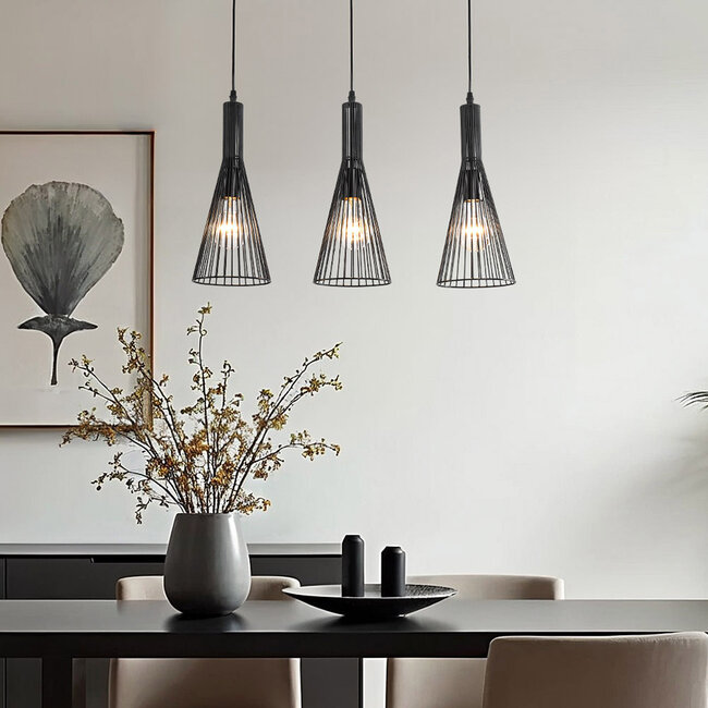 Vous êtes un fan du style d'intérieur moderne, industriel ou design ? Le design élégant de cette lampe suspendue s'adapte à tous les styles de vie. Que ce soit dans le salon ou dans l'entrée, la lampe suspendue Sofia peut être utilisée partout. Grâce à ses 3 sources lumineuses, la lampe suspendue noire peut facilement éclairer une longue table ou une grande pièce. Cette lampe suspendue de style industriel est donc l'éclairage idéal pour le dessus de la table à manger. Sofia est une combinaison de trois lampes gracieuses réparties symétriquement sur une base en métal. Les sources de lumière sont entourées d'abat-jour faits de tiges métalliques légèrement courbées. La construction des abat-jour crée de belles ombres dans l'environnement, où la lumière est agréablement diffusée. La lampe Sofia crée ainsi une atmosphère agréable à la maison, aussi bien le jour que le soir. Le résultat est surprenant, surtout en combinaison avec des sources lumineuses à filament LED. Optez-vous pour un éclairage d'ambiance supplémentaire ? Le pendentif Sofia est gradable avec un variateur externe. Le variateur externe, comme les sources lumineuses, n'est pas inclus. La lampe a une largeur de 15 cm, une hauteur de 36 cm et une longueur totale de 62 cm. Vous ne vous lassez pas de la lampe suspendue Sofia ? Cette lampe est également disponible en tant que lampe individuelle avec 1 point lumineux.