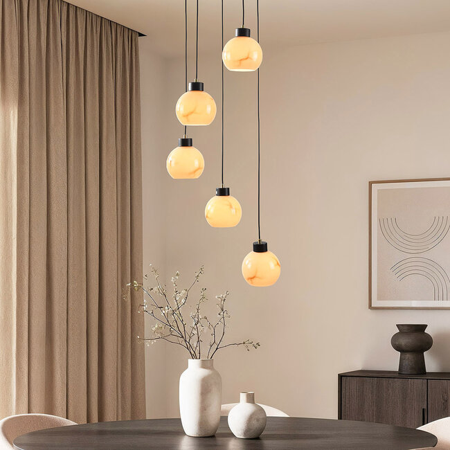 Cette lampe suspendue élégante avec des globes en verre aspect marbre ajoute instantanément une touche de luxe à votre intérieur. Grâce à sa lumière atmosphérique et à son design chic, cette lampe suspendue est parfaite pour être placée au-dessus d'une table à manger ou comme pièce maîtresse dans le couloir. L'éclat chaleureux du verre marbré crée une ambiance chaleureuse et sophistiquée, parfaite pour les intérieurs modernes ou contemporains. Un véritable accroche-regard qui allie atmosphère et élégance.