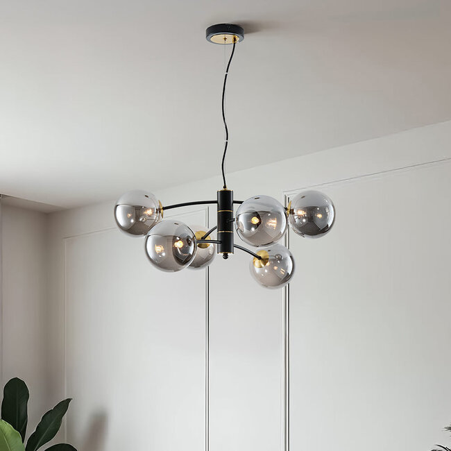 Murano se compose d'un cadre en métal noir de haute qualité et de six ampoules en verre fumé. Les six ampoules en verre sont fixées à l'extrémité du cadre qui peut être facilement tourné pour placer les ampoules dans n'importe quelle position. La lampe a un diamètre total de 67 cm et une hauteur réglable de 117 cm. La plaque de plafond a un diamètre de 12 mm et une hauteur de 2,5 cm. Les six ampoules en verre ont un diamètre de 15 cm.