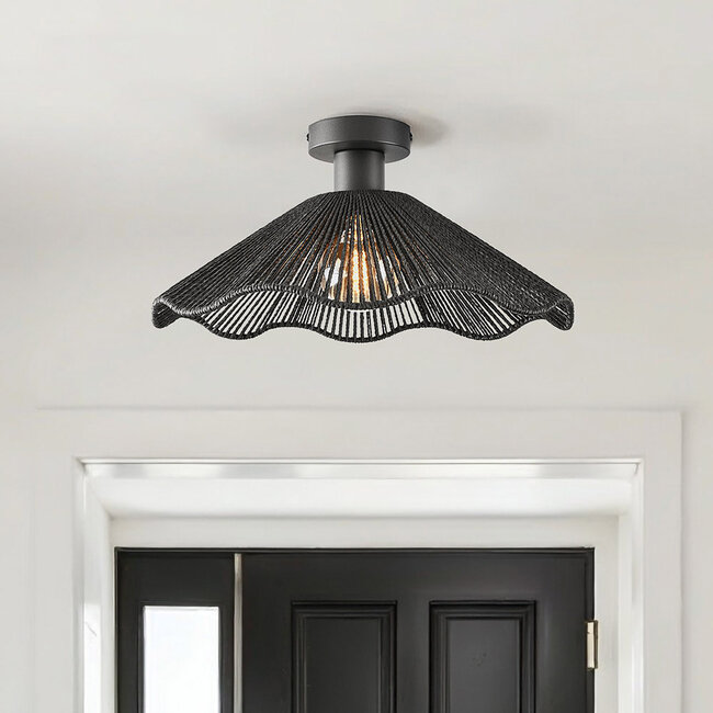 Grâce à sa taille compacte de Ø40 cm, cette lampe convient à de nombreux espaces. Le plafonnier a une hauteur de 20 cm avec une plaque de plafond de Ø10 cm. L'abat-jour ajouré est composé de métal noir et d'une corde en papier noir durable tissée naturellement.