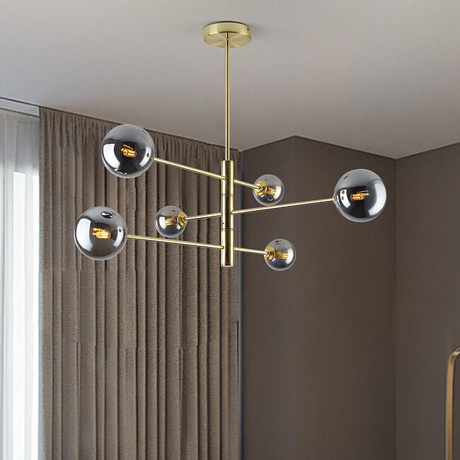 Un plafonnier chic et ludique ? C'est Sest. Ce superbe plafonnier doré apporte une atmosphère sophistiquée à n'importe quelle pièce. Les boules en verre fumé, disposées de façon ludique sur la structure, ajoutent une touche de classe à un intérieur moderne ou minimaliste. Que vous placiez Sest au-dessus d'une table à manger, d'un bar de cuisine ou dans un coin salon, il deviendra le centre d'attention de l'espace. De plus, Sest offre une finition luxueuse à votre salon ou à votre chambre à coucher.
