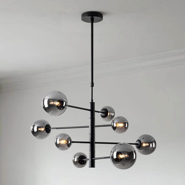 Le luminaire noir est fabriqué en fer de haute qualité et les ampoules à fumée sont en verre. La plaque de plafond a un diamètre de 12 cm et une hauteur de 2,5 cm. La hauteur totale de la lampe est réglable, vous pouvez choisir entre 75 et 110 cm, et la largeur d'Oito est de 86 cm. Les ampoules en verre ont deux tailles différentes : Ø9 cm et Ø12 cm. La lampe est facile à assembler.