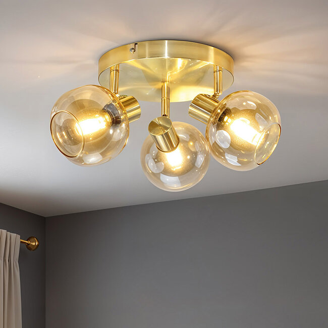 Ce plafonnier Jenthe apporte une touche de sophistication à chaque pièce. Son cadre doré s’accorde parfaitement avec les abat-jours en verre ambré, qui diffusent une lumière douce et chaleureuse, créant ainsi une ambiance luxueuse.