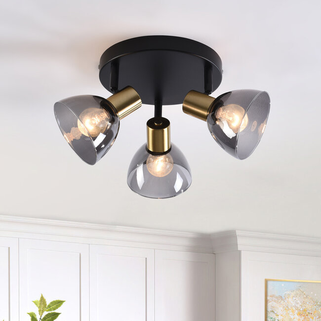 Un projecteur de plafond qui allie fonctionnalité et élégance. C'est Kyam. La base noire et le verre fumé créent un look chic. Les trois spots sont inclinables, ce qui permet de diriger la lumière vers un point précis.