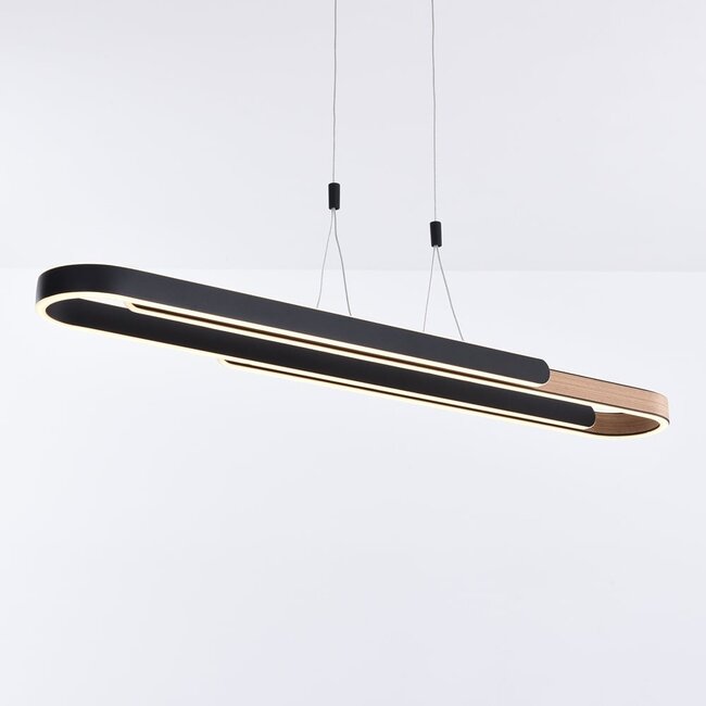 Cette lampe suspendue de forme élancée mesure 100 x 17 x 150 cm. La lampe est facile à raccourcir, ce qui vous permet de décider de la hauteur à laquelle elle est suspendue. Le cadre est fabriqué en acier, en aluminium et en PVC de haute qualité et est disponible en noir avec un placage en bois. Les LED intégrées (2700K, lumière chaude) sont dotées d'une fonction de gradation à 3 niveaux, avec une puissance maximale de 34 watts et 3600 lumens. Avec une telle luminosité, la lampe est un choix idéal pour être suspendue au-dessus de votre table à manger, mais aussi au-dessus de votre îlot de cuisine.