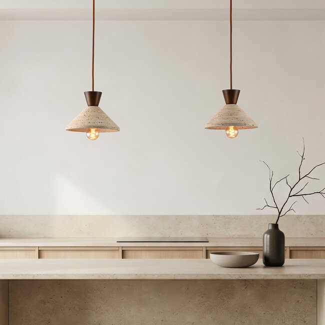Apportez calme et chaleur à votre intérieur grâce à ce design raffiné. La combinaison du travertin et du bois crée un équilibre naturel, tandis que les deux abat-jours coniques forment un ensemble harmonieux au-dessus d'une table à manger ou d'un îlot de cuisine. Les abat-jours ouverts laissent subtilement apparaître les sources lumineuses, créant ainsi un éclairage doux et accueillant. La plaque de plafond sombre, associée aux câbles textiles, forme un contraste moderne et crée un jeu de lignes épuré au plafond. Mara est équipée de deux douilles E27 (sources lumineuses non incluses), vous permettant de déterminer vous-même l'apparence et l'intensité lumineuse.