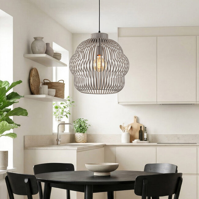 La suspension Kova présente une forme ondulée et organique avec une structure ouverte en métal gris clair. Les tiges ondulées confèrent à la lampe un caractère aérien et créent un jeu subtil d'ombres et de lumières. Le design ouvert met en valeur une source lumineuse décorative et diffuse la lumière de manière douce dans la pièce. Avec un diamètre de 40 cm et une hauteur réglable, Kova convient au-dessus de la table à manger, dans le hall d'entrée ou dans le salon. La lampe est équipée d'une douille E27 (source lumineuse non incluse), afin que vous puissiez créer vous-même l'ambiance. Le câble et la plaque de plafond sont de la même couleur gris clair pour un ensemble harmonieux.