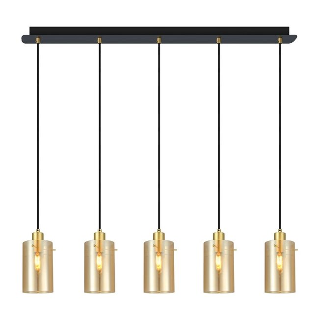 La suspension Seattle comporte cinq abat-jour de forme cylindrique, qui sont fixés à une suspension étroite. Le verre des abat-jour est ambré, ce qui lui donne un aspect moderne et chaleureux. Le sable doré lui donne ce petit design en plus. Le verre donne une belle brillance sur les côtés, la lumière vers le bas brille sans être obstruée. Cette lampe s'adapte parfaitement au-dessus d'une table à manger ou d'une autre table de votre maison.