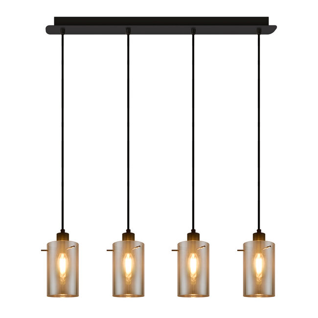La suspension Worth comporte quatre abat-jour cylindriques fixés à une suspension étroite. Le verre des abat-jour fumé, ce qui lui confère un aspect moderne. Le verre masque l'éclat de la lumière sur les côtés, la lumière vers le bas brille sans entrave. Cette lampe s'adapte parfaitement au-dessus d'une table à manger ou d'une autre table de votre maison.