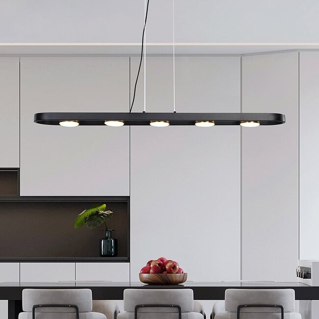 Le cadre allongé, en métal de haute qualité, présente une finition noire élégante, rehaussée par cinq anneaux dorés accueillant les points lumineux. La lampe mesure 1 mètre de long, 13 cm de large et 150 cm de haut. Avec un indice de protection IP20, elle est destinée uniquement à un usage intérieur.